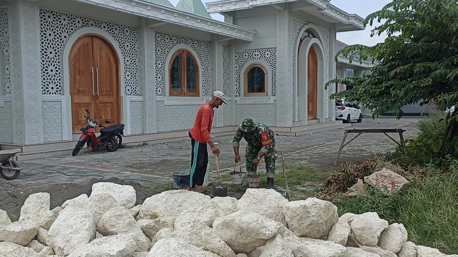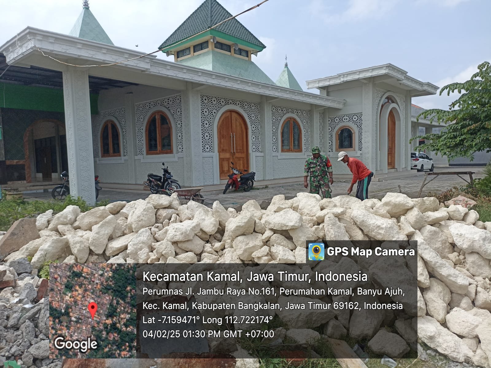Bangkalan |Jatim | Babinsa Koramil 0829-03/Kamal bersama masyarakat melakukan gotong royong dalam pembanguan Masjid yang terletak di Desa Banyuajuh Kecamatan Kamal Kabupaten Bangkalan, Selasa (4/2/25).