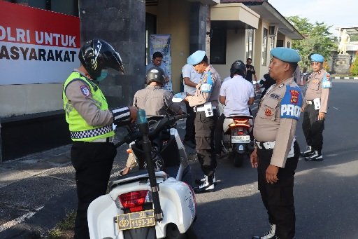 Kasi Propam Polres Karangasem AKP I Nyoman Surantika, S.H., bersama anggota melaksanakan Operasi Penegakan Ketertiban dan Kedisiplinan (Gaktibplin) di pintu masuk Mako Polres Karangasem. Pada Rabu, (3/12/2025).