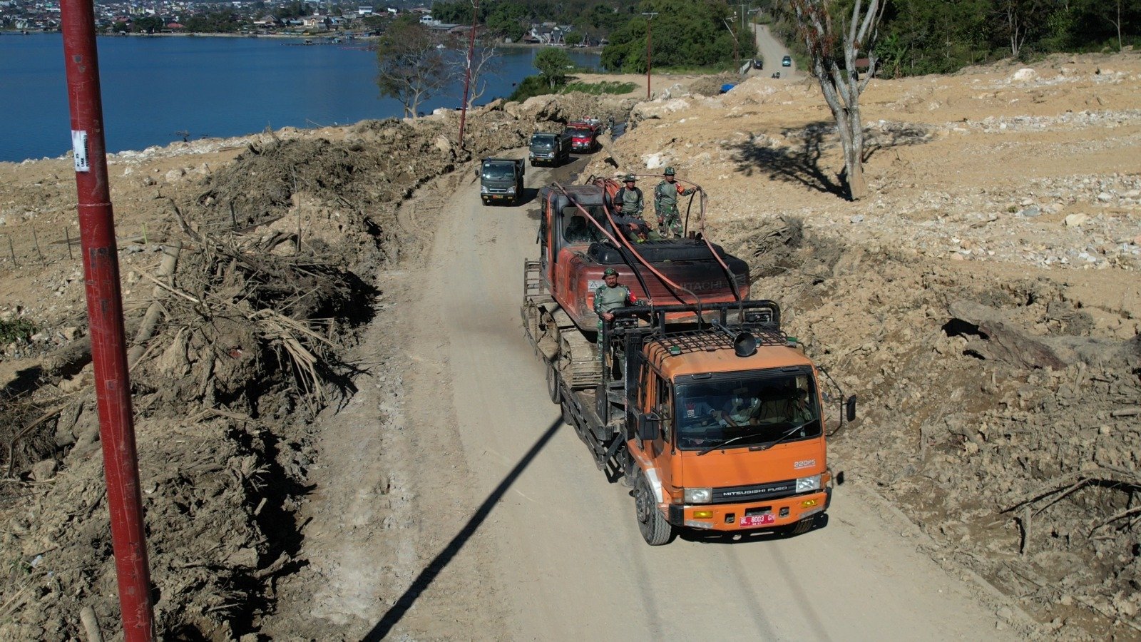 Alat berat tersebut terdiri dari dua unit buldoser satu dari TNI, satu nya dari BNPB, satu unit ekskavator, dua unit Damtruk TNI dan satu unit Damkar yang dioperasikan untuk membersihkan material longsor serta memperbaiki infrastruktur yang rusak.