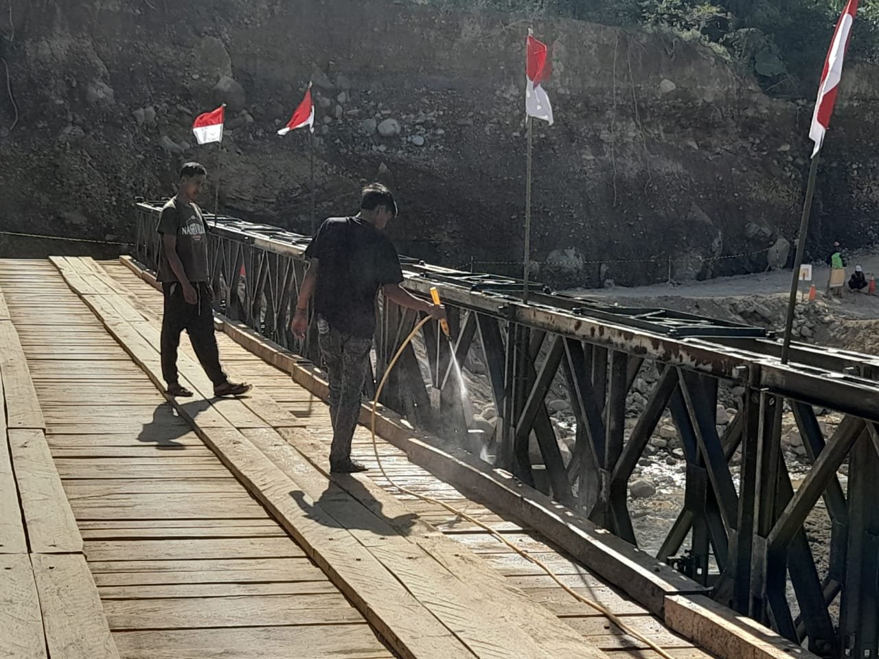 Adapun sejumlah tahapan yang telah dilaksanakan meliputi uji coba kekuatan Jembatan Bailey, pembersihan besi dan struktur jembatan, serta pengecekan akhir untuk memastikan aspek keamanan dan kelayakan sebelum jembatan dibuka secara resmi.