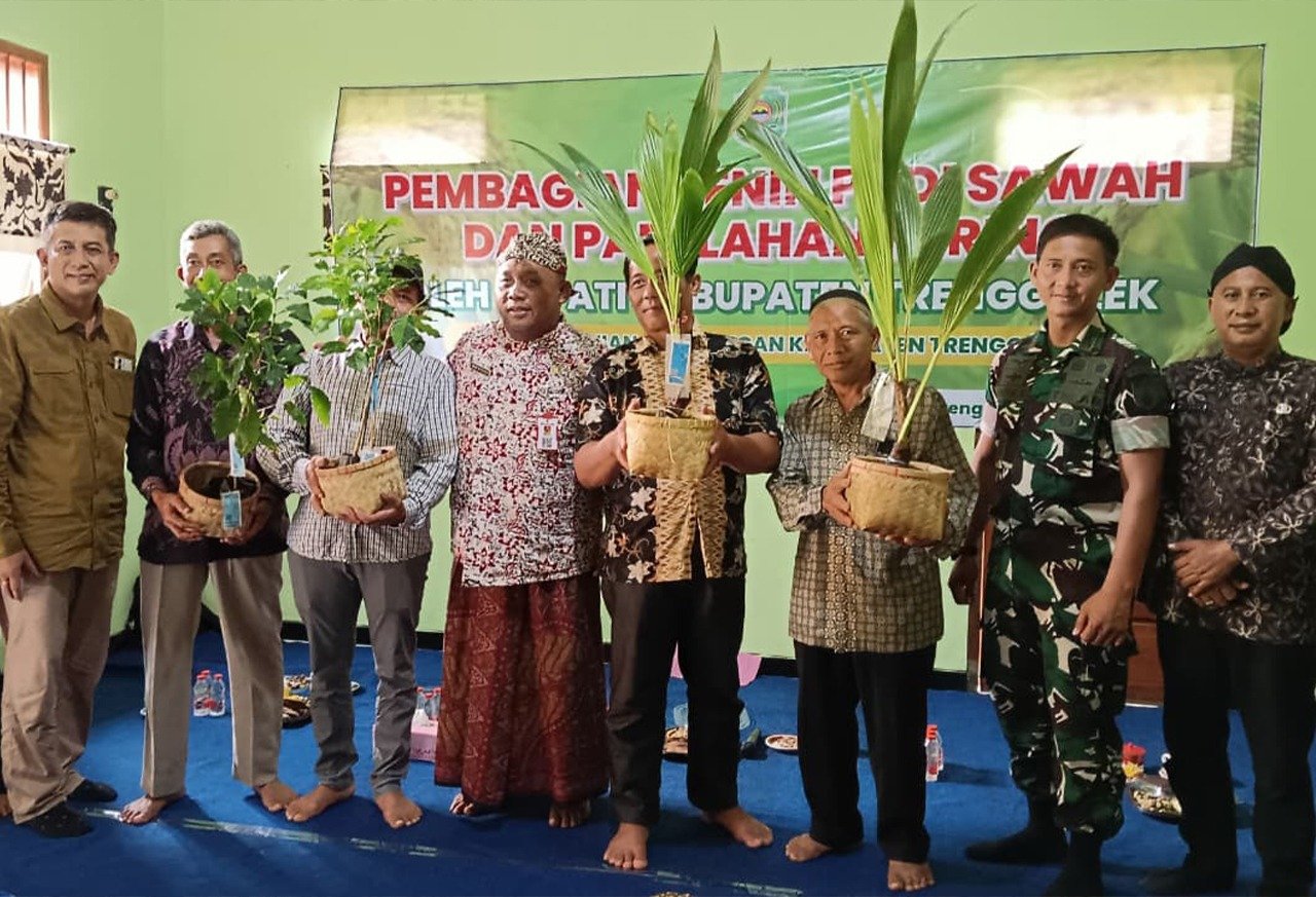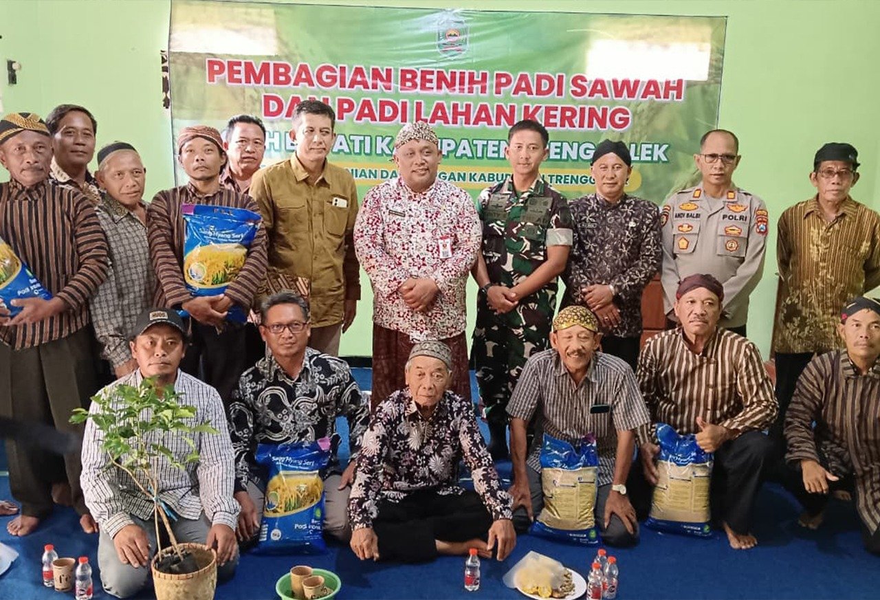 Trenggalek – Jatim| Upaya memperkuat ketahanan pangan nasional kembali ditunjukkan melalui sinergitas TNI, Polri, dan pemerintah daerah. Seperti yang ditunjukan Kodim 0806/Trenggalek bersinergi dengan Polres Trenggalek dan Dinas Pertanian dan Pangan Kabupaten Trenggalek menyalurkan benih padi sawah, benih padi gogo (lahan kering), bibit kelapa, dan bibit kopi kepada para petani di Gapoktan Sari Makmur, Desa Salamrejo, Kecamatan Karangan, Kamis (6/11/2025). Program ini menjadi bukti dukungan pemerintah pusat yang terus digencarkan hingga level desa demi memperkuat swasembada pangan.