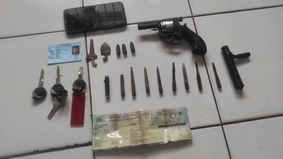 Adapun barang bukti yang berhasil diamankan petugas yakni, motor pelaku dan motor korban, satu pucuk senjata api rakitan, warna hitam, 3 butir peluru, kunci L, 8 buah mata kunci L, 1 kunci magnet dan satu handphone warna hitam.