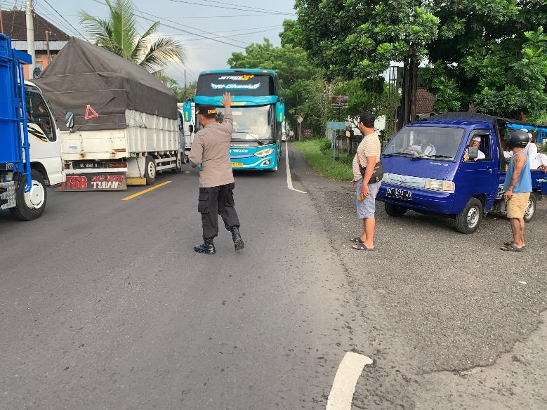 Guna mengantisipasi kemacetan aksi cepat dan sigap personel Polsek Pekutatan Polres Jembrana menangani peristiwa truk bermuatan besar yang mogok di jalur utama Denpasar–Gilimanuk, tepatnya di KM 65/66 wilayah Banjar Swastika, Desa Pangyangan, Kecamatan Pekutatan, pada Kamis, (23/10/2025) siang.