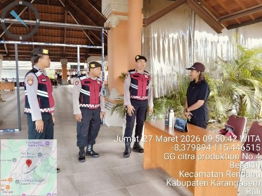 Personel Unit Pamobvit Sat Samapta Polres Karangasem melaksanakan kegiatan sambang dan patroli dialogis di kawasan Obyek Wisata Pura Besakih, Desa Besakih, Kecamatan Rendang, Kabupaten Karangasem. Pada Jum’at (27/03/2026) pukul 08.00 sampai pukul. 13.00 Wita.