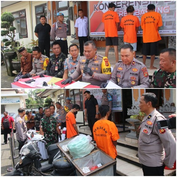 Kapolres Badung AKBP M. Arif Batubara, SH., S.I.K., M.H., M.Tr., Opsla, didampingi Waka Polres Badung Kompol I Made Pramasetia, S.H., S.I.K, M.H., Danramil Mengwi 1611/04 Mengwi Mayor Kav. I Ketut Darmawan, Kapolsek Mengwi Kompol I Ketut Adnyana, Kasatresnarkoba AKP I Nyoman Sudarma S.H., M.H., Kanit Reskrim Polsek Mengwi AKP I Komang Juniawan, S.H., M.H., Kasipropam Res Badung AKP I Nyoman Sutanaya, SH dan Ps. Kasihumas Ipda I Putu Sukarma serta menggandeng Forkopimcam Mengwi, guna membeberkan hasil pengungkapan dalam konferensi pers di Lobby Polsek Mengwi Jalan I Gusti Ngurah Rai 110, Banjar Denkayu Delodan, Desa Werdi Bhuwana, Kecamatan Mengwi, Kabupaten Badung, Bali. Pada Selasa, (18/2/2025 ).