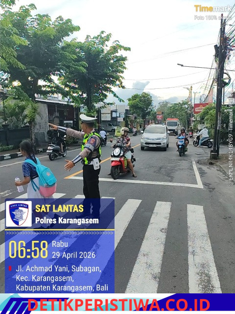 “Arus lalulintas siang ini sangat padat dan ramai maka kegiatan penyebrangan anak sekolah di pintu masuk depan SDN 4 Subagan kami laksanakan setiap murid pulang sekolah demi menjaga keselamatan semua anak-anak serta arus lalulintas pun tetap lancar dan kondusif, “ucap Aipda Km Sukanadi, Rabu, 29 April 2026 , pukul 06.30 wita.