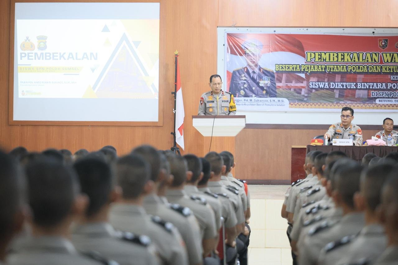Wakapolda Sumsel Brigjen. Pol. M, Zulkarnain S.Ik., M.S.i, memberikan pembekalan kepada 459 Siswa Diktukba Polri bertempat di Sekolah Polisi Negara (SPN) Polda Sumsel, Kamis (12/12/2024).