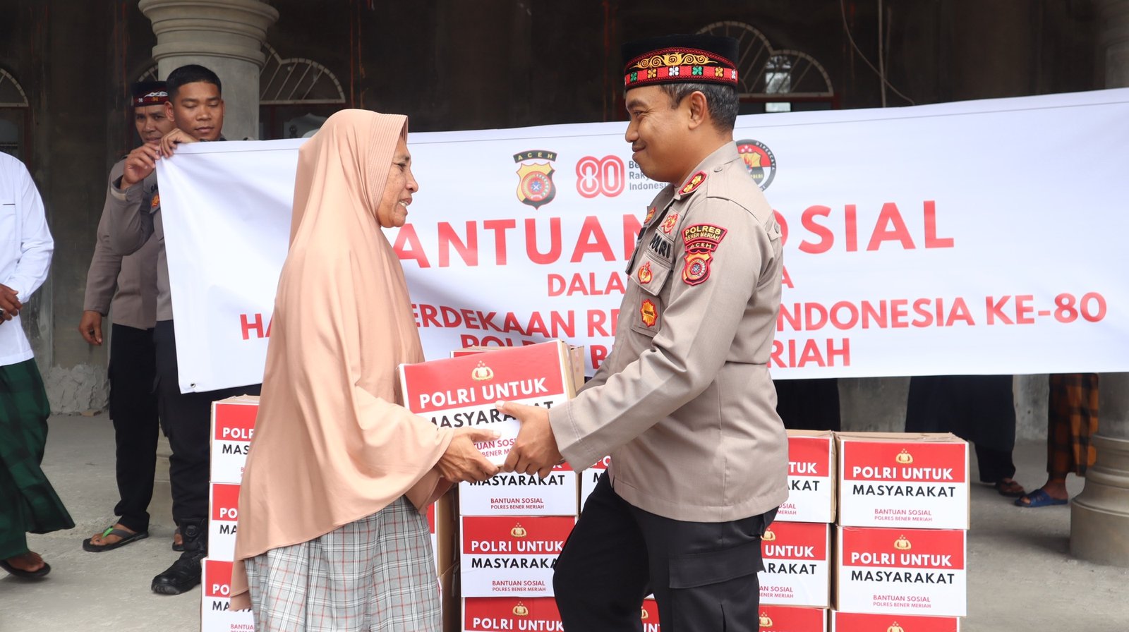 Redelong – Dalam rangka menyambut HUT RI ke-80, Polres Bener Meriah menunjukkan kepeduliannya kepada masyarakat dengan menyalurkan 20 bantuan sosial berupa paket sembako kepada warga kurang mampu. Kegiatan ini berlangsung di Masjid Nurul Huda, Desa Simpang Rahmat, Kecamatan Gajah Putih, pada Jumat (08/08/2025).