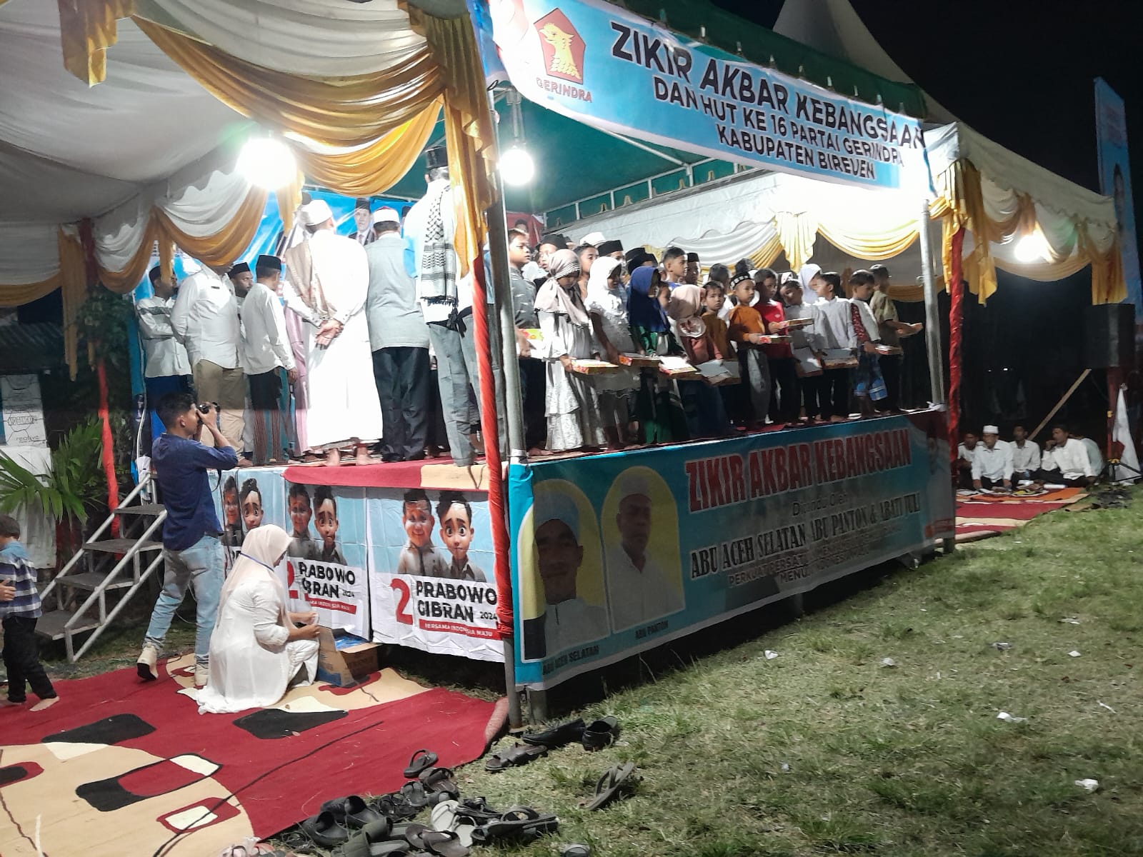 Zikir Akbar kebangsaan dan HUT Partai Gerindra Kabupaten Bireuen yang dilaksanakan di Lapangan Gampong Baro Sukses dihadiri sekitar 400 otang jamah ,9/2/2024
